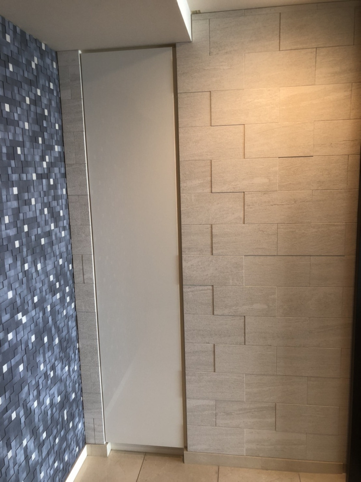 はい、こちらの壁にあるベージュと青色のタイルです。