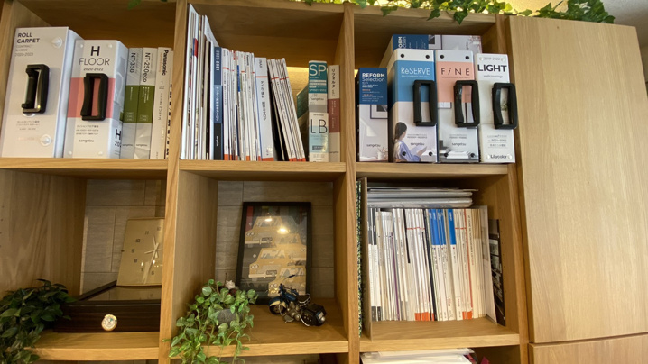 上段の分厚いカタログたちが主に床材や壁紙のサンプルになっています。