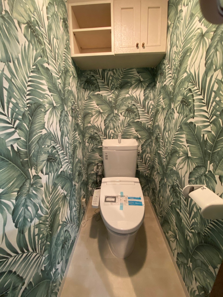 上段の吊戸棚と床、トイレ本体の色合いが揃っているので、